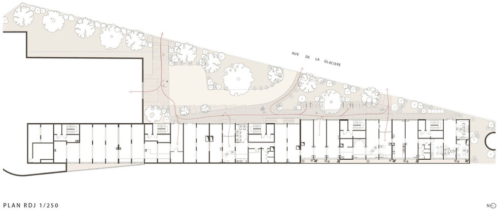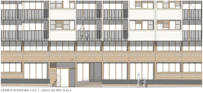 Les rez-de-chaussée sont réorganisés : transformation de logements vacants en locaux vélos et OM, mise en accessibilité partielle des halls (R+12), création de trémies vitrées pour apporter de la lumière aux ERP en sous-sol (bibliothèque, église), et aménagement de volumes signalétiques en façade Glacière pour renforcer leur visibilité.